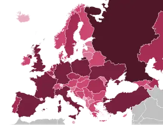 - ↑ Population in million: Albania 2.9, Belarus 9.5, Bosnia and Herzegovina 3.5, Iceland 0.3, Moldova 4.1, North Macedonia 2.1, Norway 5.2, Serbia and Kosovo 8.9, Switzerland 8.3, Ukraine 44.7.