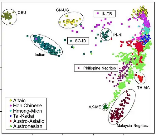 - ↑ The HUGO Pan-Asian SNP Consortium; Abdulla, Mahmood Ameen; Ahmed, Ikhlak; Assawamakin, Anunchai; Bhak, Jong; et al. (11 December 2009). "Mapping Human Genetic Diversity in Asia". Science. 326 (5959): 1541–1545. Bibcode:2009Sci...326.1541.. doi:10.1126/science.1177074. ISSN 0036-8075. PMID 20007900. S2CID 34341816.