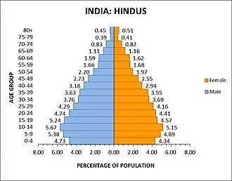 In 2023, the median age of an Indian was 29.5 years,[19] compared to 39.8 for China and 49.5 for Japan; and, by 2030; India's dependency ratio will be just over 0.4.[20] However, the number of children in India peaked more than a decade ago and is now falling. The number of children under the age of five peaked in 2007, and since then the number has been falling. The number of Indians under 15 years old peaked slightly later (in 2011) and is now also declining.[21]