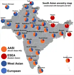 - 1 2 Majumder (23 February 2010). "The Human Genetic History of South Asia: A Review". Current Biology. 20 (4): R184-7. Bibcode:2010CBio...20.R184M. doi:10.1016/j.cub.2009.11.053. PMID 20178765. S2CID 1490419.