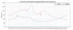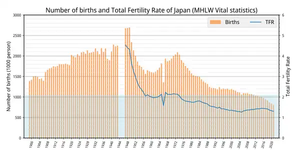 According to a demographic study conducted by Japanese Ministry of Internal Affairs and Communications, the Japanese population (including foreign residents) declined from 128 million people in 2010 to 124.3 million people in 2023, with a decrease of almost 511,000 people in one year.[16][17]