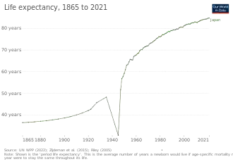 Since 2010, Japan has experienced net population loss due to falling birth rates and minimal immigration, despite having one of the highest life expectancies in the world, at 85.00 years as of 2016 (it stood at 81.25 as of 2006).[4] Using the annual estimate for October of each year, the population peaked in 2008 at 128,083,960 and had fallen by 2,983,352 by October 2021.[5]