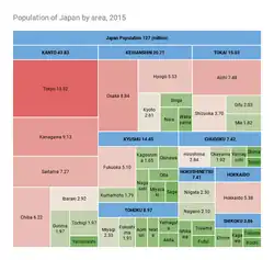 Distribution of population[24] by regions (blue shades) and prefectures (red: most populous; green: less).