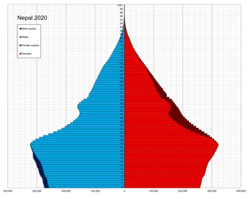 In the 2011 census, Nepal's population was approximately 26 million people with a population growth rate of 1.35% and a median age of 21.6 years.[5]