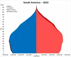 South America population pyramid in 2023 based on the United Nations geoscheme for the Americas South America grouping.