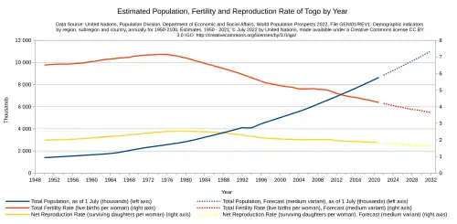 Registration of vital events is in Togo not complete. The Population Departement of the United Nations prepared the following estimates. Population estimates account for under numeration in population census.