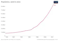 According to the 2022 revision of the World Population Prospects[2][3] the total population was 8,644,829 in 2021, compared to only 1 395 000 in 1950. The proportion of children below the age of 15 in 2010 was 39.6%, 56.9% was between 15 and 65 years of age, while 3.4% was 65 years or older .[4]
