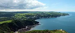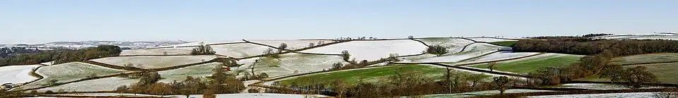 Devon's second major rock system[23] is the Culm Measures, a geological formation of the Carboniferous period that occurs principally in Devon and Cornwall. The measures are so called either from the occasional presence of a soft, sooty coal, which is known in Devon as culm, or from the contortions commonly found in the beds.[24] This formation stretches from Bideford to Bude in Cornwall, and contributes to a gentler, greener, more rounded landscape. It is also found on the western, north and eastern borders of Dartmoor.
