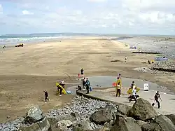 North Devon is very rural with few major towns except Barnstaple, Great Torrington, Bideford and Ilfracombe. Devon's Exmoor coast has the highest cliffs in southern Britain, culminating in the Great Hangman, a 318 m (1,043 ft) "hog's-back" hill with a 250 m (820 ft) cliff-face, located near Combe Martin Bay.[19] Its sister cliff is the 218 m (715 ft) Little Hangman, which marks the western edge of coastal Exmoor. One of the features of the North Devon coast is that Bideford Bay and the Hartland Point peninsula are both west-facing, Atlantic facing coastlines; so that a combination of an off-shore (east) wind and an Atlantic swell produce excellent surfing conditions. The beaches of Bideford Bay (Woolacombe, Saunton, Westward Ho! and Croyde), along with parts of North Cornwall and South Wales, are the main centres of surfing in Britain.
