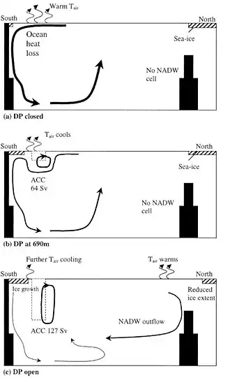 Several studies have linked the current shape of the Drake Passage to an effective Atlantic meridional overturning circulation (AMOC). Models have been run with different widths and depths of the Drake Passage, and consequent changes in the global oceanic circulation and temperature distribution have been analyzed:[12][15] It appears that the "conveyor belt" of the global thermohaline circulation appears only in presence of an open Drake Passage, subject to wind forcing.[12] With a closed Drake Passage, there is no North Atlantic Deep Water (NADW) cell, and no ACC. With a shallower Drake Passage, a weak ACC appears, but still no NADW cell.[15]