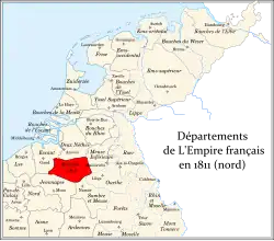 Dyle (French: [dil], Dutch: Dijle) was a department of the French First Republic and French First Empire in present-day Belgium. It was named after the river Dyle (Dijle), which flows through the department. Its territory corresponded more or less with that of the Belgian province of Brabant, now divided into Walloon Brabant, Flemish Brabant and the Brussels-Capital Region. It was created on 1 October 1795, when the Austrian Netherlands and the Prince-Bishopric of Liège were officially annexed by the French Republic.[4] Before the annexation, its territory was partly in the Duchy of Brabant, partly in the County of Hainaut, and partly in some smaller territories.