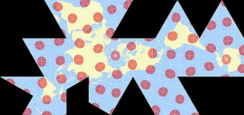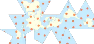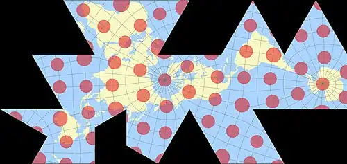 {{cite journal}}: CS1 maint: DOI inactive as of November 2024 (link) - ↑ Gray, Robert W. (1995-10-01). "Exact Transformation Equations for Fuller's World Map". Cartographica: The International Journal for Geographic Information and Geovisualization. 32 (3): 17–25. doi:10.3138/1677-3273-Q862-1885. ISSN 0317-7173.