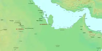 Eastern Arabia (Arabic: ٱلْبَحْرَيْن, romanized: Al-Baḥrayn) is a region stretched from Basra to Khasab[1] along the Persian Gulf coast and included parts of modern-day Bahrain, Iraq, Kuwait, Oman, Qatar, Saudi Arabia (Eastern Province), and the United Arab Emirates. The entire coastal strip of Eastern Arabia was known as "Bahrain" for a millennium.[1]