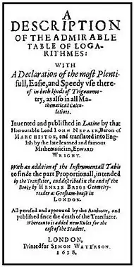 - Napier, John (1618), A Description of the Admirable Table of Logarithmes: With a Declaration of the Most Plentifull, Easie and Speedy Use thereof in both kinds of Trigonometry, as also in all Mathematicall Calculations. Invented and Published inn Latine by that Honourable Lord John Nepair, Baron of Marchiston, and translated into English by the late learned and famous Mathematician, Edward Wright. With an Addition of the Instrumentall Table to finde the part of the Proportionall, intended by the Translator, and described in the end of the Booke by Henrie Brigs Geometry-reader at Gresham House in London. All Perused and Approved by the Authour, and Published since the Death of the Translator. Whereunto is added New Rules for the Ease of the Student, translated by Wright, E[dward] (2nd ed.), London: Printed for Simon Waterson.