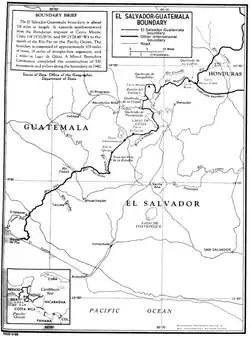 The El Salvador–Guatemala border is a 203 km (126 mi) international boundary in the northeast–southwest direction, northwest of El Salvador, and separating the country from the territory of Guatemala. From north to south, it starts in the triple border of the two countries with Honduras, near the peak Monte Cristo in Volcanoes National Park, extending to the southwest by the Pacific Ocean coast, following the final stage the Rio Paz. It separates the department of Jutiapa in Guatemala from Ahuachapan (north) and Santa Ana departments in El Salvador. It runs along 105 mi (169 km) of rivers, 19 mi (31 km) of straight-line segments and 2 mi (3.2 km) in Lake Güija. 530 boundary pillars were erected in 1940.[1]