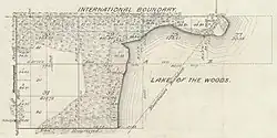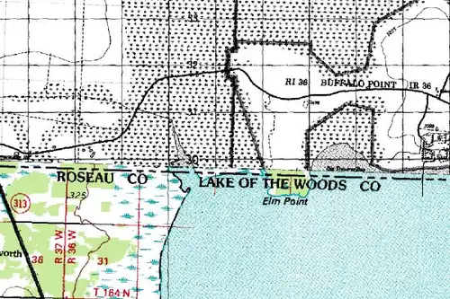 The confusion appears to result from the wording of Governor David Marston Clough's proclamation dated February 10, 1896, which annexed the area to Roseau County.[1] The boundary of the area to be annexed ran easterly along the Canadian border "to the Lake of the Woods; thence easterly, following the south meandered shore of said Lake of the Woods." From the point where the Canadian border intersects Lake of the Woods, the shoreline first runs west around Elm Point and then south before turning east, making the wording of the proclamation infelicitous. The proclamation, however, states that the territory annexed includes the area of Township 164 North, Range 36 West, and that its boundaries "followed and conformed to the United States Survey lines of townships,"[1] as was required by law at the time.[12] Elm Point is within T164N R36W (see image at right).