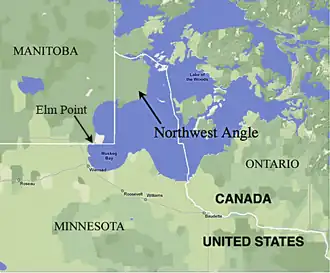 Elm Point, Minnesota, is a small uninhabited[2] cape and a practical exclave of the United States in Lake Township, Roseau County, Minnesota, United States. It is surrounded on the west, south, and east by Lake of the Woods, and on the north by the Canadian First Nation community of Buffalo Point in southeastern Manitoba. Part of Elm Point is privately owned and part of it is state land[3] managed by the Department of Natural Resources as part of the Border Wildlife Management Area.[4] It is located southwest of the much larger exclave known as the Northwest Angle.[5] There is a line of felled trees marking the international border,[6] which runs nominally along the 49th parallel, although in this area it runs slightly to the south[7] due to 19th-century surveying errors.