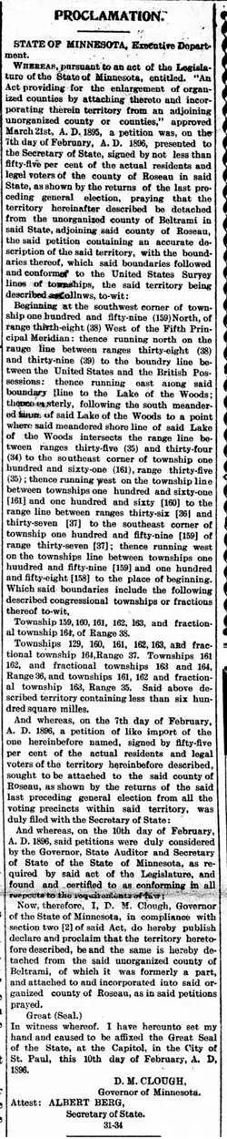 - 1 2 3 "Proclamation". Roseau County Times. February 21, 1896.
