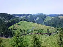 The view from the Elversstein over the Harz countryside includes the Brocken (1,141.1 m above NN), the highest mountain in the Harz. In addition, the Trans-Harz Railway can be seen on the far side of the Drängetal and, sometimes, a train on this narrow gauge railway may be seen entering or leaving the 58 metre long Thumkuhlenkopf Tunnel.