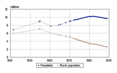 The population of Belarus suffered a dramatic decline during World War II, dropping from more than 9 million in 1940 to 7.7 million in 1951. It then resumed its long-term growth, rising to 10 million in 1999.[4] After that the population began a steady decline, dropping to 9.7 million in 2006–2007.[5] Originally a highly agrarian country with nearly 80% of its population in rural areas, Belarus has been undergoing a process of continuous urbanization. The rural population saw its share of the total population decrease from 70% in 1959 to less than 30% in the 2000s.[6]