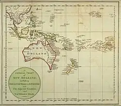Britain claimed territory encompassing all of Australia eastward of the meridian of 135° East and all the islands in the Pacific Ocean between the latitudes of Cape York and the southern tip of Van Diemen's Land (Tasmania). The western limit of 135° East was set at the meridian dividing New Holland from Terra Australis, as shown on Emanuel Bowen's Complete Map of the Southern Continent,[26] published in John Campbell's editions of John Harris' Navigantium atque Itinerantium Bibliotheca, or Voyages and Travels (1744–1748, and 1764).[27] It was a vast claim which elicited excitement at the time: the Dutch translator of First Fleet officer and author Watkin Tench's A Narrative of the Expedition to Botany Bay wrote: "a single province which, beyond all doubt, is the largest on the whole surface of the earth. From their definition it covers, in its greatest extent from East to West, virtually a fourth of the whole circumference of the Globe."[28]