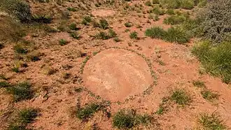 An Australian cross-cultural study published in April 2023, involving local Martu peoples and using their traditional knowledge of the phenomenon, are pavement nests occupied by Drepanotermes (Australian harvester termites). The research showed that the circles may have been created in the Pleistocene (over 12,000 years ago), and that termites lived in them and were continuing to build them. Aboriginal peoples have lived on the Australian continent for up to 65,000 years and have deep knowledge passed down through their oral traditions.[11][12] However, this study did not account for the actual mechanism which causes the Australian fairy circles.[14] Detailed research on the specific Australian fairy circles, conducted between 2014 and 2019, has shown that the bare-soil gaps are caused by abiotic weathering of the soil surface, resulting in clay crusts and inhibition of grass growth within the circles.[8][24][29]