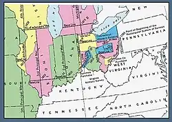 The first principal meridian is a meridian that began[1] at the junction of the Ohio River and Great Miami River. It extends north on the boundary line between the states of Ohio and Indiana, and roughly approximates to the meridian of longitude 84° 48′ 50″ west from Greenwich. The ranges of the public surveys in the state of Ohio, west of the Scioto River, are (in part) numbered from this meridian.