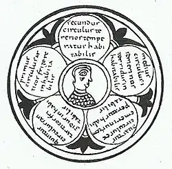 Bishop Isidore of Seville (560–636) taught in his widely read encyclopedia, the Etymologies, diverse views such as that the Earth "resembles a wheel"[97] resembling Anaximander in language and the map that he provided. This was widely interpreted as referring to a disc-shaped Earth.[98][99] An illustration from Isidore's De Natura Rerum shows the five zones of the Earth as adjacent circles. Some have concluded that he thought the Arctic and Antarctic zones were adjacent to each other.[100] He did not admit the possibility of antipodes, which he took to mean people dwelling on the opposite side of the Earth, considering them legendary[101] and noting that there was no evidence for their existence.[102] Isidore's T and O map, which was seen as representing a small part of a spherical Earth, continued to be used by authors through the Middle Ages, e.g. the 9th-century bishop Rabanus Maurus, who compared the habitable part of the northern hemisphere (Aristotle's northern temperate clime) with a wheel. At the same time, Isidore's works also gave the views of sphericity, for example, in chapter 28 of De Natura Rerum, Isidore claims that the Sun orbits the Earth and illuminates the other side when it is night on this side. See French translation of De Natura Rerum.[103] In his other work Etymologies, there are also affirmations that the sphere of the sky has Earth in its center and the sky being equally distant on all sides.[104][105] Other researchers have argued these points as well.[7][106][107] "The work remained unsurpassed until the thirteenth century and was regarded as the summit of all knowledge. It became an essential part of European medieval culture. Soon after the invention of typography it appeared many times in print."[108] However, "The Scholastics – later medieval philosophers, theologians, and scientists – were helped by the Arabic translators and commentaries, but they hardly needed to struggle against a flat-Earth legacy from the early middle ages (500–1050). Early medieval writers often had fuzzy and imprecise impressions of both Ptolemy and Aristotle and relied more on Pliny, but they felt (with one exception), little urge to assume flatness."[7]