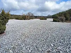 The flint fields on Germany's biggest island, Rügen, between Mukran and Prora in the northern part of the heath of Schmale Heide are part of the Stone Fields in the Schmale Heath and Extension nature reserve. They were also called the Steinernes Meer ("stony sea") and have an area of 40 hectares (2,000 × 200 metres). During a series of storm floods, 3,500 to 4,000 years ago, the stones, from the Cretaceous deposits on the Jasmund peninsula which had been broken up by the sea, were piled up here. The layer of flints is so thick that it does not allow more than a sparse vegetation layer.