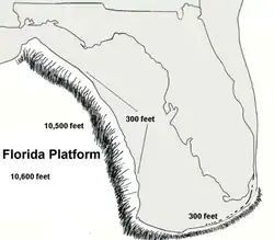 The platform's basement rocks include Precambrian–Cambrian igneous rocks, Ordovician–Devonian sedimentary rocks, and Triassic–Jurassic volcanic rock. [1] Florida's igneous and sedimentary foundation separated from what is now the African Plate when the supercontinent Pangaea rifted apart in the middle Triassic and possibly early-middle Jurassic. It then secured to the North American craton.[2] One of the early geologic structures is the Peninsular Arch which formed during the Jurassic.