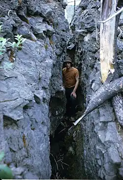 - "I had to send the pack train back...on account of the absence of feed and the rough nature of the valley, which from here to the summit is covered with volcanic rocks, somewhat similar to the formation near the summit on the Howe Sound Route. In this instance, the surface is not quite so rough and irregular, the rocks are smaller in size, and the volcanic action seems to have been more intense. The centre of the valley here is higher than at the sides by about 100 feet...On the 21st we had travelled about two miles when we came to the end of the volcanic formation, and noticed the water running eastward."[1]
