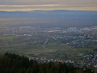 ![]() View of Offenburg looking west, with the Vosges (Mont Donon) in the background | |