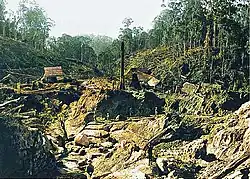 Fraser's Hill is named after Louis James Fraser (1841[7]–1916[8]), a Scottish trader and accountant. After a failed gold mining venture in Australia, he migrated to the Federated Malay States in 1890 looking for a new venture in tin mining.[9] He set up a tin-ore trading post in Tras. As mining activity flourished at the foot of Fraser's Hill, Fraser became a tin merchant and bought crude tin ore from Malay and Chinese miners in Tras and Sempam and used mules to transport the ores to Kuala Kubu. He later recruited guides and coolies and formed an expedition to search the upper ridges for valuable minerals such as gold. The expedition found an ancient forest of moss-draped trees and ferns that resembled prehistoric forests. A cloud layer kept the vegetation constantly moist. At the same time, Fraser found rich tin deposits on the hill and recruited Chinese miners to open a mine known as Pamah Lebar which would later become the current location of Fraser's Hill golf course. A track was then constructed for mules to carry tin ore to The Gap and Kuala Kubu. Fraser then moved his tin ore trading base from Tras to Fraser's Hill.[10] The first mining lease was officially issued to Abu Suradi in November 1899;[9] the last one was issued in 1906 to Robert Lewis and the Sempam Mining Company Limited. However, as the tin ore was depleted quickly by 1913,[11] mining activity declined, and many Chinese miners and farmers moved away from the town.[12]