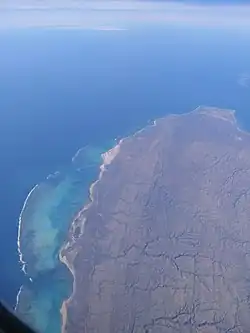 A fringing reef is one of the three main types of coral reef. It is distinguished from the other main types, barrier reefs and atolls, in that it has either an entirely shallow backreef zone (lagoon) or none at all. If a fringing reef grows directly from the shoreline, then the reef flat extends to the beach and there is no backreef. In other cases (e.g., most of the Bahamas), fringing reefs may grow hundreds of yards from shore and contain extensive backreef areas within which it contains food and water. Some examples of this are Philippines, Indonesia, Timor-Leste, the western coast of Australia, the Caribbean, East Africa, and Red Sea.[1][2][3] Charles Darwin believed that fringing reefs are the first kind of reefs to form around a landmass in a long-term reef growth process.[4] The largest fringing coral reef in the world is the Ningaloo Reef, stretching to around 260 km (160 mi) along the coastline of Western Australia.[1]