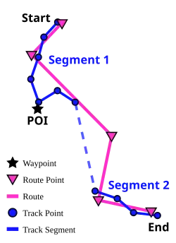 - A track (trk) consists of possibly multiple segments (trkseg), which in turn each contain a series of waypoints (trkpt). It is typically used to represent journeys which somebody has already completed or recorded.