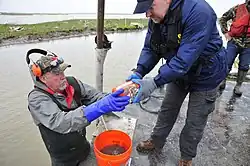A large commercial fishing industry has grown around Galveston Bay, with significant production of shrimp, blue crab, eastern oyster, black drum, flounder, sheepshead, and snapper.[63] In 2012, the commercial fish harvest in Galveston Bay amounted to 5,800,000 pounds (2,600,000 kg), with a wholesale value of roughly $16.4 million.[64]