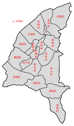 The township comprises 19 villages: Cailiao, Dapu, Gaoshu, Guangfu, Guangxing, Jianxing, Jiuliao, Jiuzhuang, Nanhua, Sima, Taishan, Tianzi, Tungxing, Tungzhen, Xinfeng, Xinnan, Yanshu, Yuanquan and Zhangrong.