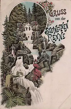 This natural feature was already described as the Steinrenne or steinerne Rinne by the Early Modern Period. With the rise of tourism in the middle of the 19th century the Steinerne Renne became one of the most popular beauty spots in the Harz. When the Harz and Brocken Railways were built a small station was even built for the Steinerne Renne which still exists today. In 1869 a log cabin was built immediately next to the waterfall, the predecessor of the present-day hotel.