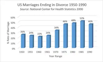 The Gen X childhood coincided with the sexual revolution of the 1960s to 1980s, which Susan Gregory Thomas described in her book In Spite of Everything as confusing and frightening for children in cases where a parent would bring new sexual partners into their home.[71] Thomas also discussed how divorce was different during the Gen X childhood, with the child having a limited or severed relationship with one parent following divorce, often the father, due to differing societal and legal expectations. In the 1970s, only nine U.S. states allowed for joint custody of children, which has since been adopted by all 50 states following a push for joint custody during the mid-1980s.[72] Kramer vs. Kramer, a 1979 American legal drama based on Avery Corman's best-selling novel, came to epitomize the struggle for child custody and the demise of the traditional nuclear family.[73]
