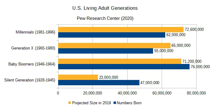 There are differences in Gen X population numbers depending on the date-range selected. In the U.S., using Census population projections, the Pew Research Center found that the Gen X population born from 1965 to 1980 numbered 65.2 million in 2019. The cohort is likely to overtake Boomers in 2028.[7] A 2010 Census report counted approximately 84 million people living in the US who are defined by birth years ranging from the early 1960s to the early 1980s.[60]