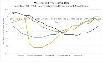 Generation X is the demographic cohort following the post–World War II baby-boom, representing a generational change from the baby boomers. Many researchers and demographers use dates that correspond to the fertility-patterns in the population. For Generation X, in the U.S. (and broadly, in the Western world), the period begins at a time when fertility rates started to significantly decrease, from the peak in the late 1950s until an upswing in the late 1970s and recovery at the start of the 1980s.