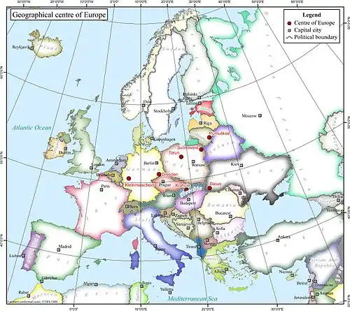 - ↑ "Geographical centre of Europe". Retrieved 27 July 2018.