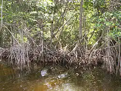 Three species of mangrove trees exist in the region: red (Rhizophora mangle), black (Avicennia germinans), and white (Laguncularia racemosa), although all are from different families.[67] All have the same characteristics: they are tolerant of salt, brackish, and fresh water; they grow in oxygen-poor soil; and they can survive drastic water-level changes.[68] Black and white mangroves excrete salt from under their leaves, and red mangroves filter the salinity of sea water. All species are integral to coastline protection during severe storms. Red mangroves, for example, have far-reaching roots that trap sediments. The trees not only stabilize coastlines, but add land as more sand and decaying vegetation is trapped in the root systems. All three mangroves also absorb the energy of waves and storm surges.