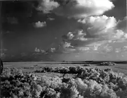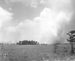 Fire is another important element in the maintenance of the Everglades. The majority are caused by lightning strikes from thunderstorms during the wet season. Their effects are largely superficial, and serve to foster further plant growth: sawgrass will burn above water, but the roots are preserved. Fire in the sawgrass marshes serves to keep out larger bushes and trees, and releases nutrients from decaying plant matter more efficiently than decomposition.[20] Large burned areas also affect waterflow, since wind and water are undeterred by the eradicated sawgrass; water may flow two to three times faster in recently burned areas.[21] During the wet season only dead plant matter and the tips of plants are burned; however, the effects of fire are much more significant in the dry season, as fire may be fed by organic peat and burn deeply, destroying root systems. The only impediment to the spread of fire in the Everglades is the presence of water. It takes around 225 years for one foot (0.3 m) of peat to develop, but the peat is not as dense as it should be for the 5,000 years of the Everglades' existence. Scientists point to fire as the reason.[3]