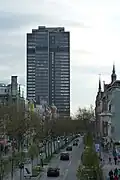 The Kurfürstendamm is home to some of Berlin's luxury shops, restaurants, and cafes, with the Kaiser Wilhelm Memorial Church at its eastern end on Breitscheidplatz (the church was destroyed in World War II and left in ruins, but was rebuilt between 1959 and 1963);[34] theaters and concert halls, such as Philharmonie Berlin and Theater am Kurfürstendamm, are also located in the neighborhood.[35] Nearby on Tauentzienstraße, is KaDeWe, continental Europe's largest department store.[36] The Rathaus Schöneberg ("City Hall"), where John F. Kennedy made his famous "Ich bin ein Berliner!" speech, is situated in Tempelhof-Schöneberg.[37]