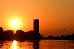 The Straße des 17. Juni, connecting the Brandenburg Gate and Ernst-Reuter-Platz, serves as a central East-West axis. Situated in the western part of the city, its name commemorates the uprisings in East Berlin of June 17, 1953.[32] Approximately half-way from the Brandenburg Gate is the Großer Stern, a circular traffic island on which the Siegessäule ("Victory Column") is situated. This monument, built to commemorate Prussia's victories, was relocated from its previous position in front of the Reichstag in 1938 by the Nazis.[33]