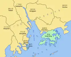 Hong Kong is on China's southern coast, 60 km (37 mi) east of Macau, on the east side of the mouth of the Pearl River estuary. It is surrounded by the South China Sea on all sides except the north, which neighbours the Guangdong city of Shenzhen along the Sham Chun River. The territory's 2,755 km2 (1,064 sq mi) area consists of Hong Kong Island, the Kowloon Peninsula, the New Territories, Lantau Island, and over 200 other islands. Of the total area, 1,073 km2 (414 sq mi) is land and 35 km2 (14 sq mi) is water.[5] The territory's highest point is Tai Mo Shan, 957 metres (3,140 feet) above sea level.[6] Urban development is concentrated on the Kowloon Peninsula, Hong Kong Island, and in new towns throughout the New Territories.[7] Much of this is built on reclaimed land, due to the lack of developable flat land; 70 km2 (27 sq mi) (six per cent of the total land or about 25 per cent of developed space in the territory) is reclaimed from the sea.[8]