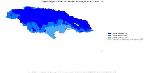 Two types of climate are found in Jamaica.[1] An upland tropical climate prevails on the windward side of the mountains, whereas a semiarid climate predominates on the leeward side.[1] Warm trade winds from the east and northeast bring rainfall throughout the year.[1] The rainfall is heaviest from May to October, with peaks in those two months.[1] The average rainfall is 1,960 millimetres (77.2 in) per year.[1] Rainfall is much greater in the mountain areas facing the north and east, however.[1] Where the higher elevations of the John Crow Mountains and the Blue Mountains catch the rain from the moisture-laden winds, rainfall exceeds 5,080 millimetres (200 in) per year.[1] Since the southwestern half of the island lies in the rain shadow of the mountains, it has a semiarid climate and receives fewer than 760 millimetres (29.9 in) of rainfall annually.[1]