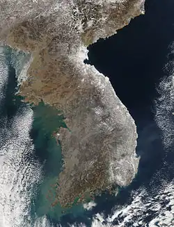 Because the mountainous region is mostly on the eastern part of the peninsula, the main rivers tend to flow westwards. Two exceptions are the southward-flowing Nakdong River and Seomjin River. Important rivers running westward include the Amnok River, the Chongchon River, the Taedong River, the Han River, the Geum River, and the Yeongsan River.[4] These rivers have extensive alluvial plains and provide an ideal environment for wet-rice cultivation.