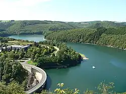 The town of Esch-sur-Sûre nestles at one end of the lake. Immediately above it, the river has been dammed to form a hydroelectric reservoir extending some 10 km (6 mi) up the valley. The Upper Sûre dam was built in the 1960s to meet the country's drinking water requirements